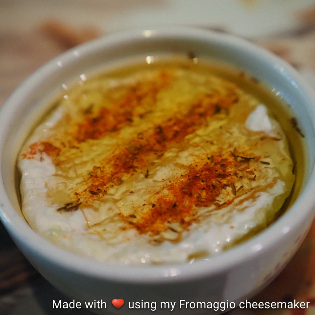 Homemade chèvre crottins marinated in a rich blend of extra virgin olive oil and Greek pita spice mix, featuring aromatic thyme, garlic, paprika, oregano, cumin, cayenne, lemon myrtle, and onion.